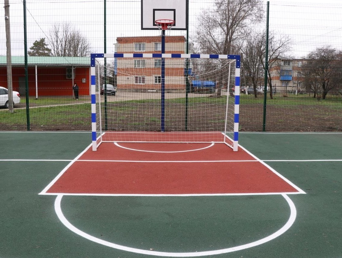 Спортивный объект включает зоны для игр в баскетбол, футбол и волейбол.