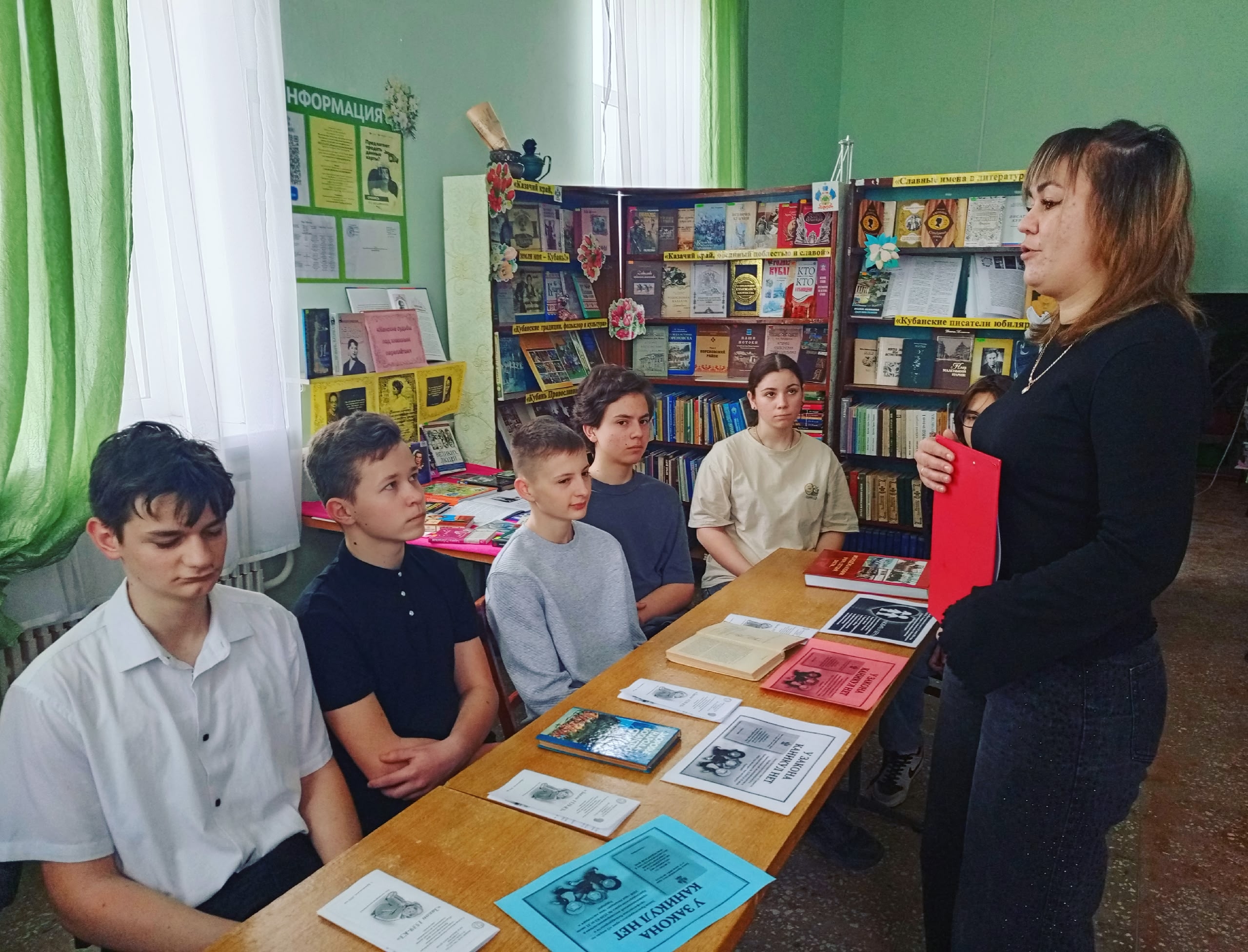 В завершении мероприятия библиотекарь познакомила учащихся с тематической книжной полкой «Приоритеты детского закона», на которой была представлена литература о современной молодёжи Кубани и особенностях воспитания подростков.